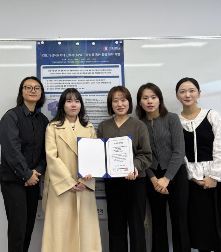 전북대학교 간호학과 박지혜·유승연·양새롬·양다혜·석주연 석사과정생이 최근 열린 2024년 한국간호행정학회 동계학술대회에서 우수포스터상을 수상했다.