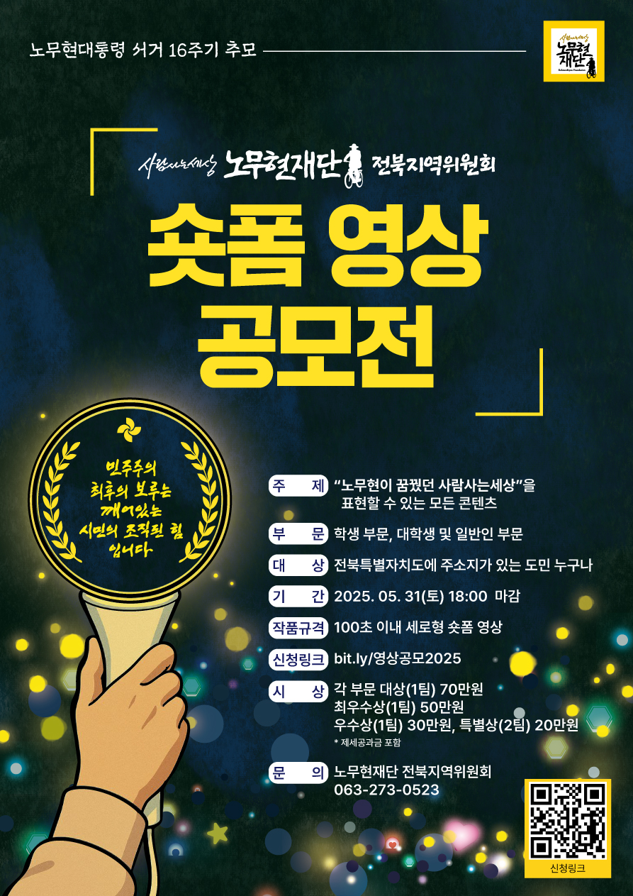노무현재단 전북지역위원회는 노무현 대통령의 철학을 시민들과 공유하고 민주주의의 가치를 실현하기 위해 설립된 단체입니다. 노무현 대통령 서거 16주기를 맞아 '노무현 대통령을 생각하면 떠오르는 시민들의 이야기'를 다양하게 담아낼 수 있는 <사람사는세상> 숏폼 영상 공모전을 개최합니다. 민주주의에 대한 애정이 가득하고 다양한 창의력을 가진 분들의 많은 관심과 참여를 바랍니다.