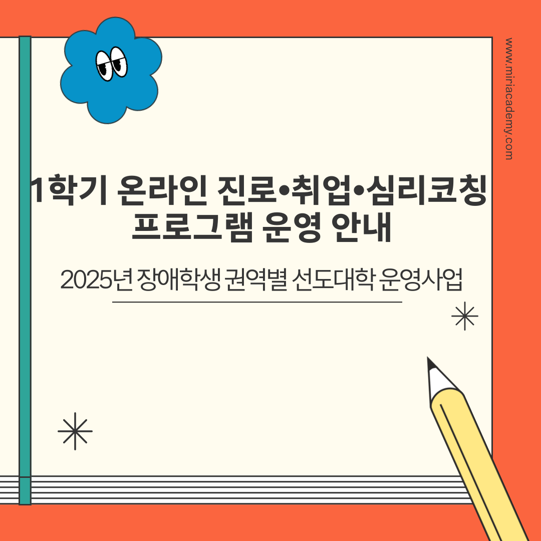 2025년 장애학생 권역별 선도대학 운영사업의 일환으로 1학기 온라인 진로·취업·심리코칭 프로그램을 다음과 같이 운영하오니 많은 참여 부탁드립니다.