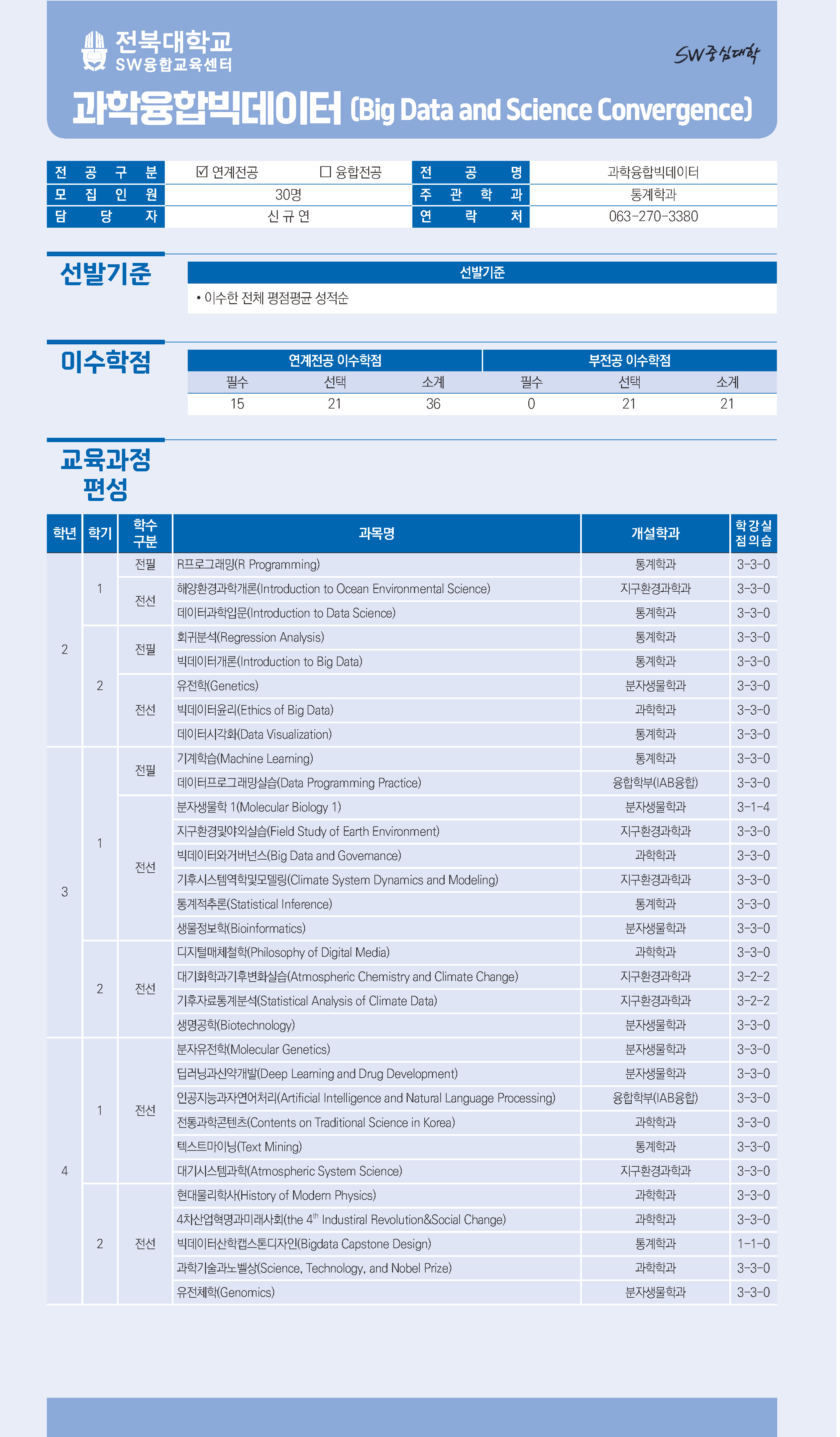 - SW연계전공: 공간정보AI, AI반도체, 스마트융합미디어학, 과학융합빅데이터, 빅데이터AI