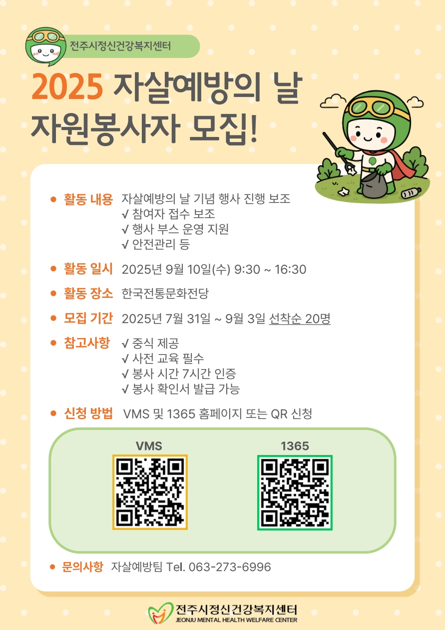 전주시정신건강복지센터에서 자살예방의 날 기념 행사 진행을 도울 봉사자를 모집합니다!