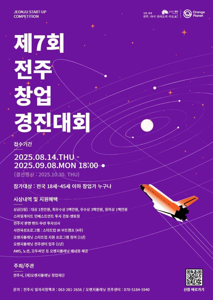 전주시와 오렌지플래닛이 함께하는 전주창업경진대회 참여자 모집 안내드립니다.