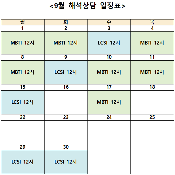 ○ 10월 심리검사 신청 일정은 9월 넷째주 월요일(9/22) 오후에 확인할 수 있습니다.