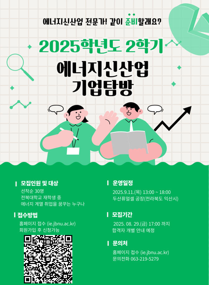 전북대학교 에너지신산업 혁신융합대학 사업단에서는 에너지신산업 분야 관심 학생의 관련 역량 강화를 위하여 2025학년도 2학기 에너지신산업 기업탐방을 진행하고자 합니다.