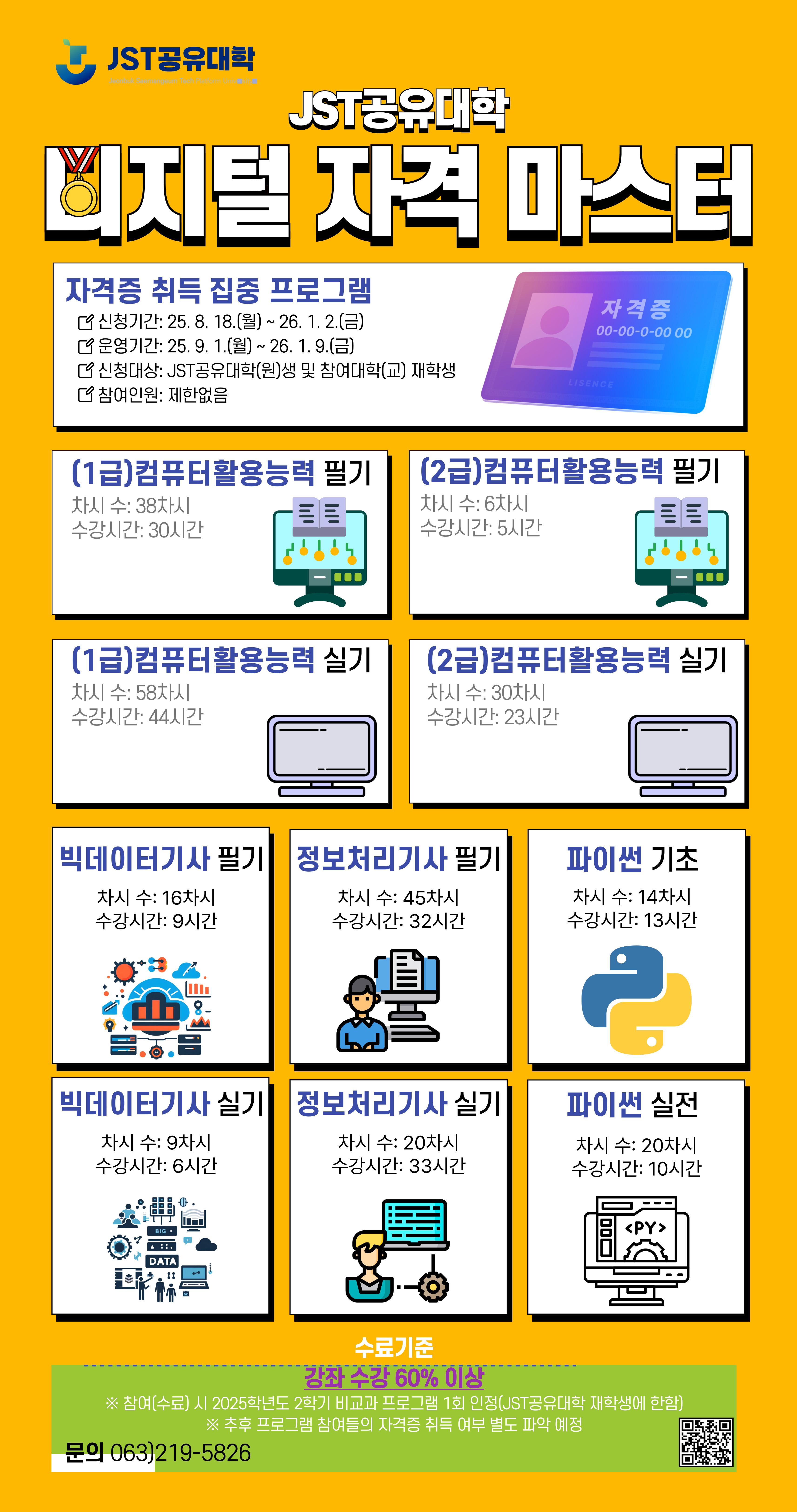 - 빅데이터기사, 정보처리기사, 컴퓨터활용능력(1급/2급), 파이썬(기초/실전) 총 10개 강좌 개설