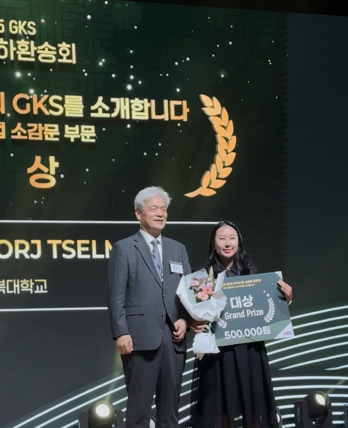 전북대학교 아동가족학과 석사과정을 마친 몽골 출신 정부초청외국인장학생(GKS) Renchindorj Tselmeg(첼멕) 학생이 지난 8월 27일 열린 졸업 축하 환송회에서 소감문 대상을 수상하고, 전체 졸업생을 대표해 고별사를 발표했다.