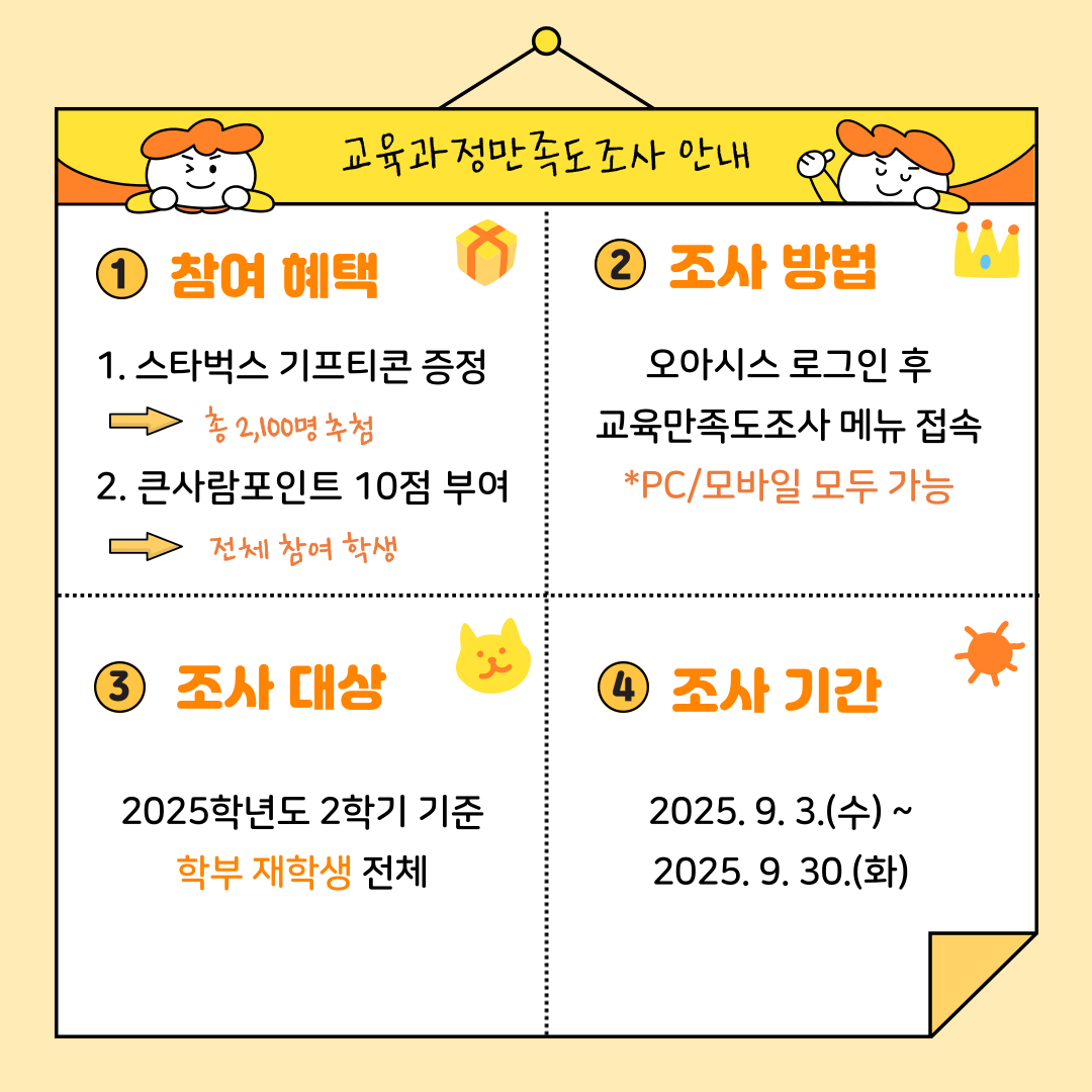 우리 대학 교육과정과 교육지원 시스템에 대한 여러분의 소중한 의견을 듣기 위해 <2025 교육과정 만족도 조사>를 실시합니다.