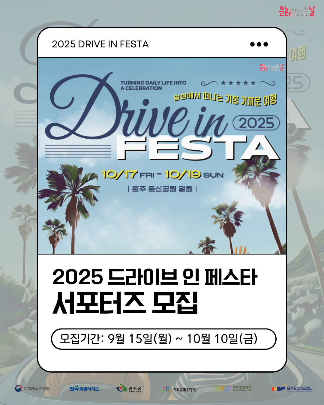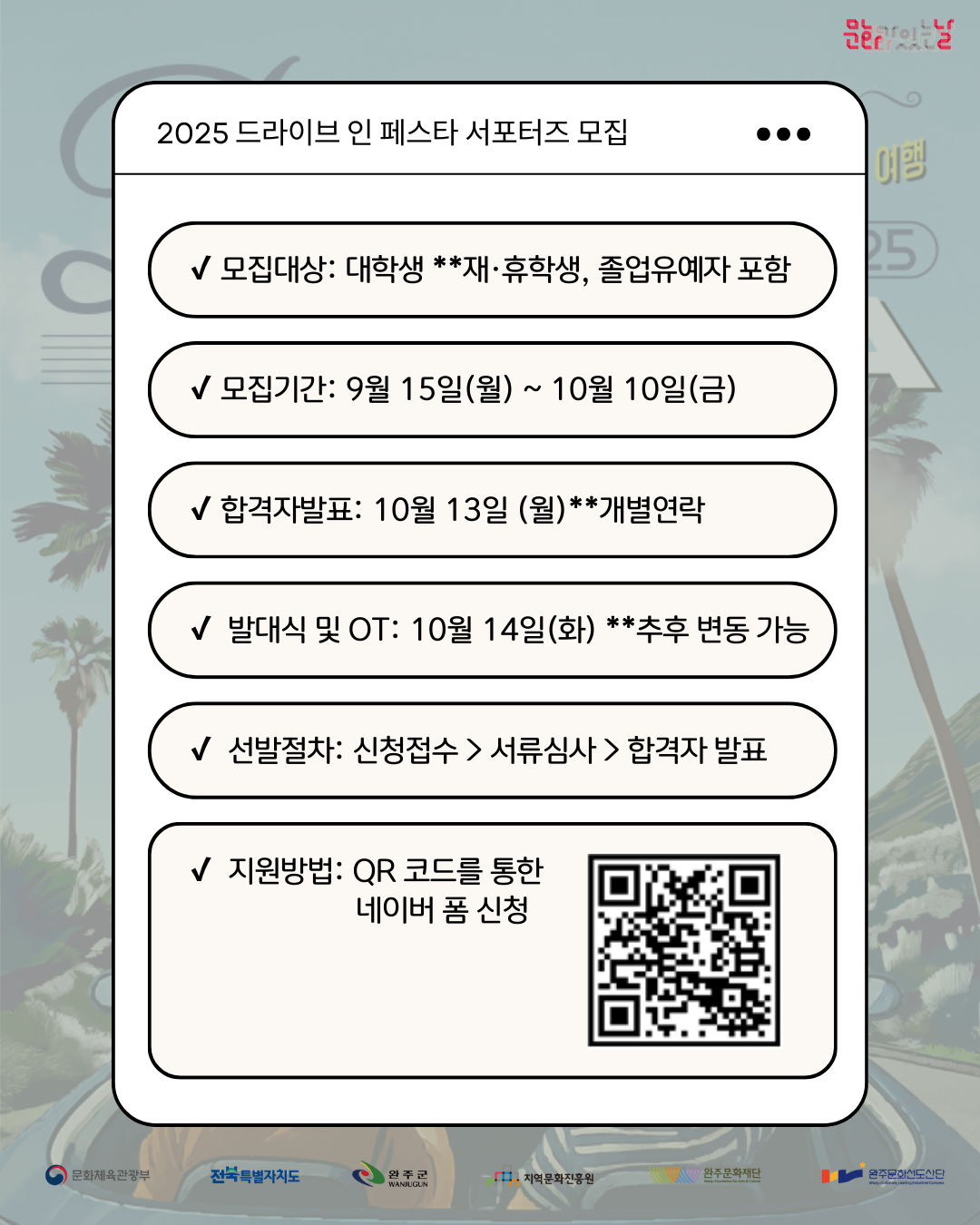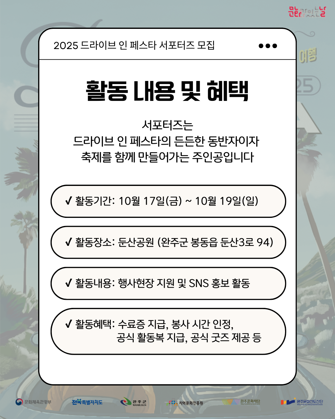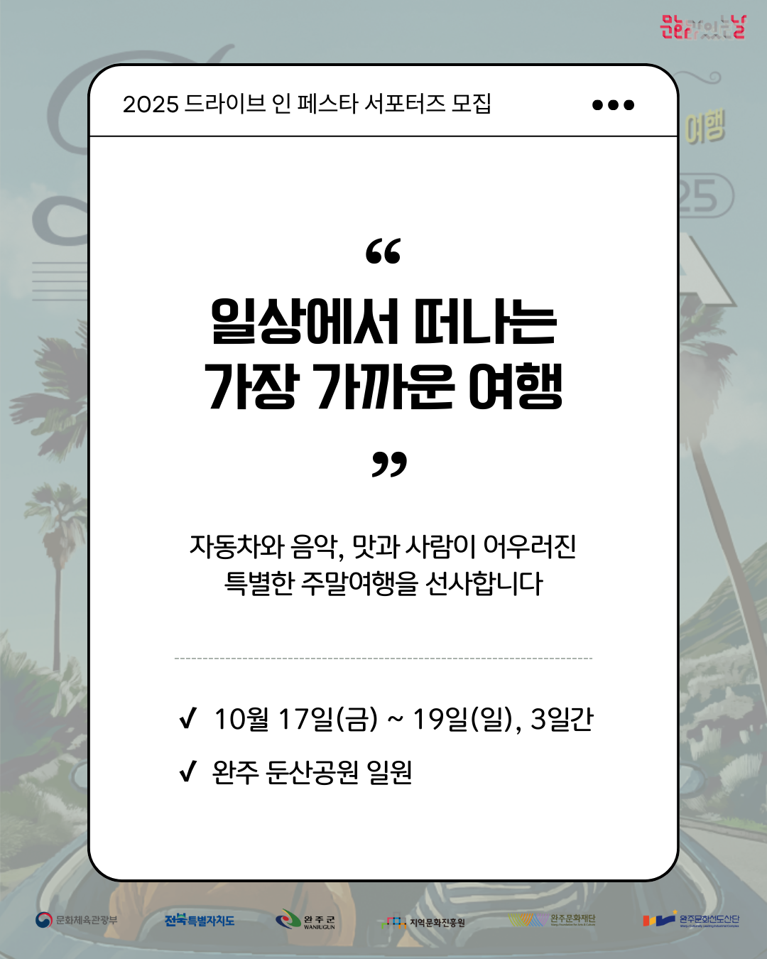 2025 ์์ฃผ ๋๋ผ์ด๋ธ ์ธ ํ์คํ ์ถ์ ์ํฌํฐ์ฆ๋ฅผ ๋ชจ์งํฉ๋๋ค