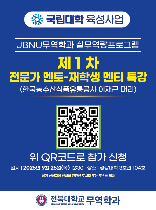 2025년도 JBNU 실무역량 무역학과 교육프로그램 전문가 멘토-재학생 멘티 특강 1차 안내