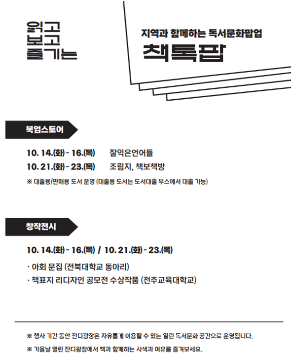 전북대는 국립대학육성사업과 글로컬대학사업의 일환으로 오는 10월 14일부터 23일까지 중앙도서관 앞 잔디광장에서 ‘책‧톡‧팝 : 읽고, 보고, 즐기는 독서 문화 팝업’을 개최한다고 13일 밝혔다.