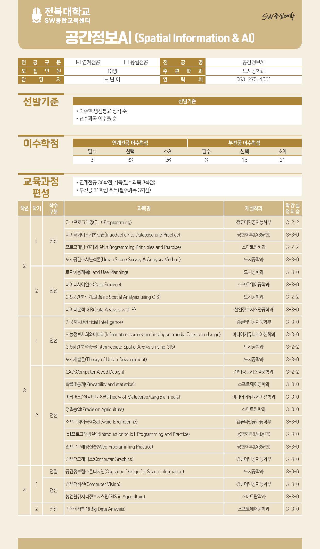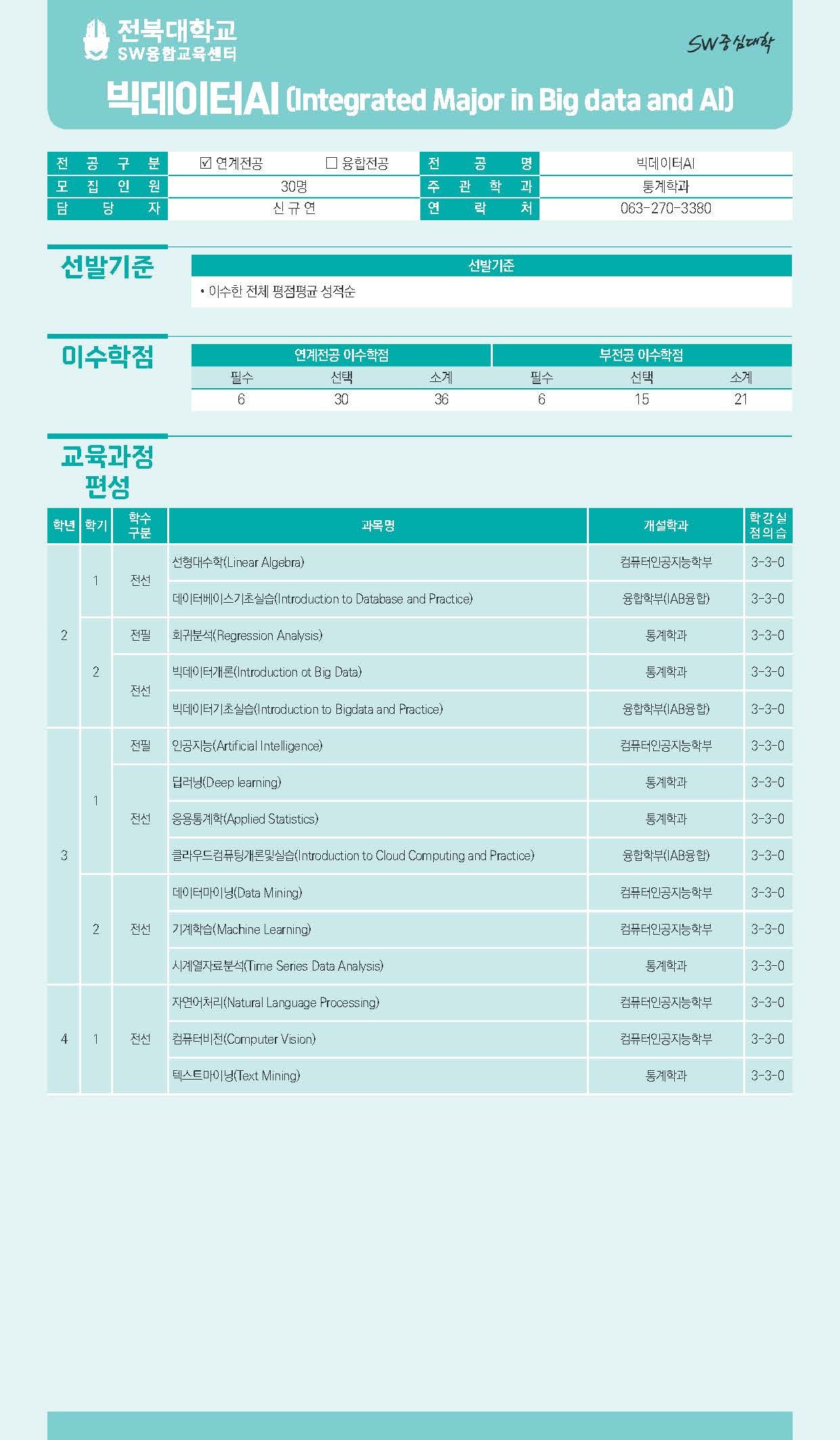 - SW연계전공: 스마트융합미디어학, 과학융합빅데이터, 공간정보AI, 메디컬AI, 스마트글로벌무역, 빅데이터AI, AI반도체, 빅데이터회계