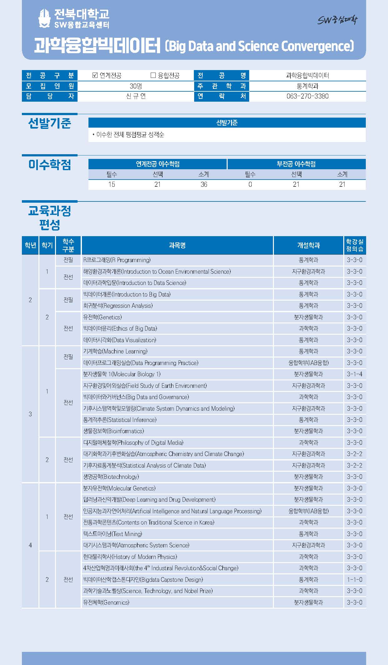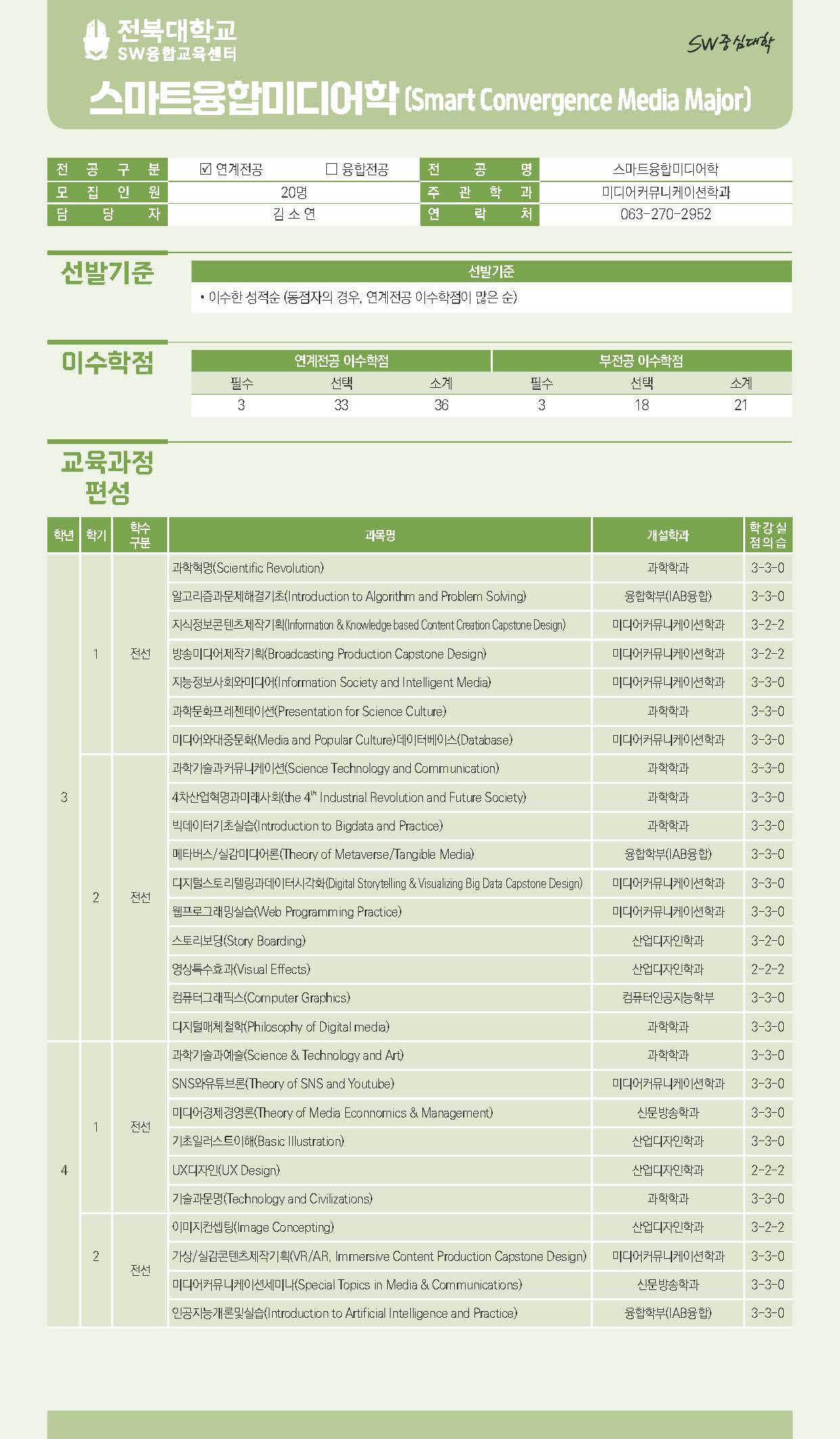 - SW연계전공: 스마트융합미디어학, 과학융합빅데이터, 공간정보AI, 메디컬AI, 스마트글로벌무역, 빅데이터AI, AI반도체, 빅데이터회계