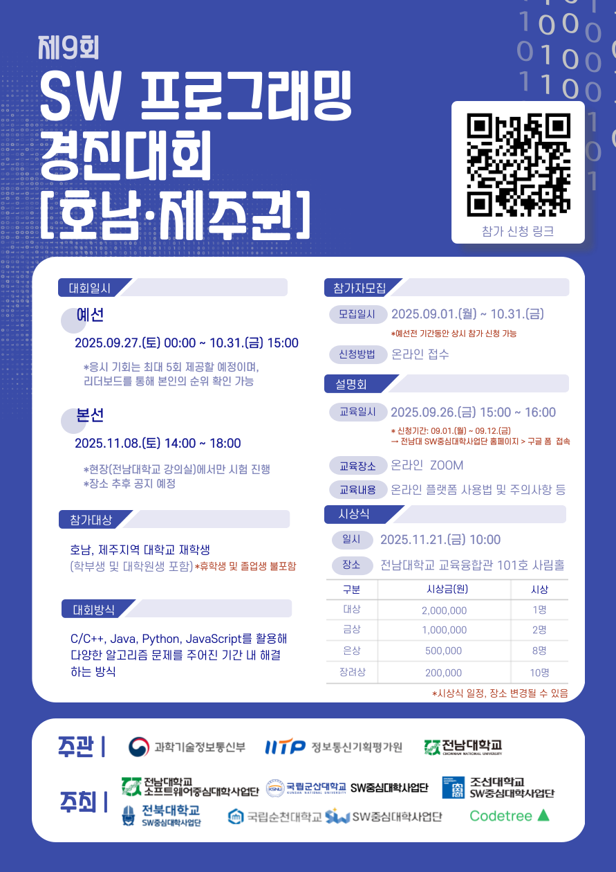 전남대학교가 주최하고 호남·제주지역의 SW인재 발굴을 위하여 『제9회 SW프로그래밍경진대회(호남·제주권) 참가 학생 모집 기간을 연장하여 안내하고 있으니, 관심 있는 학생들의 많은 신청 부탁드립니다.