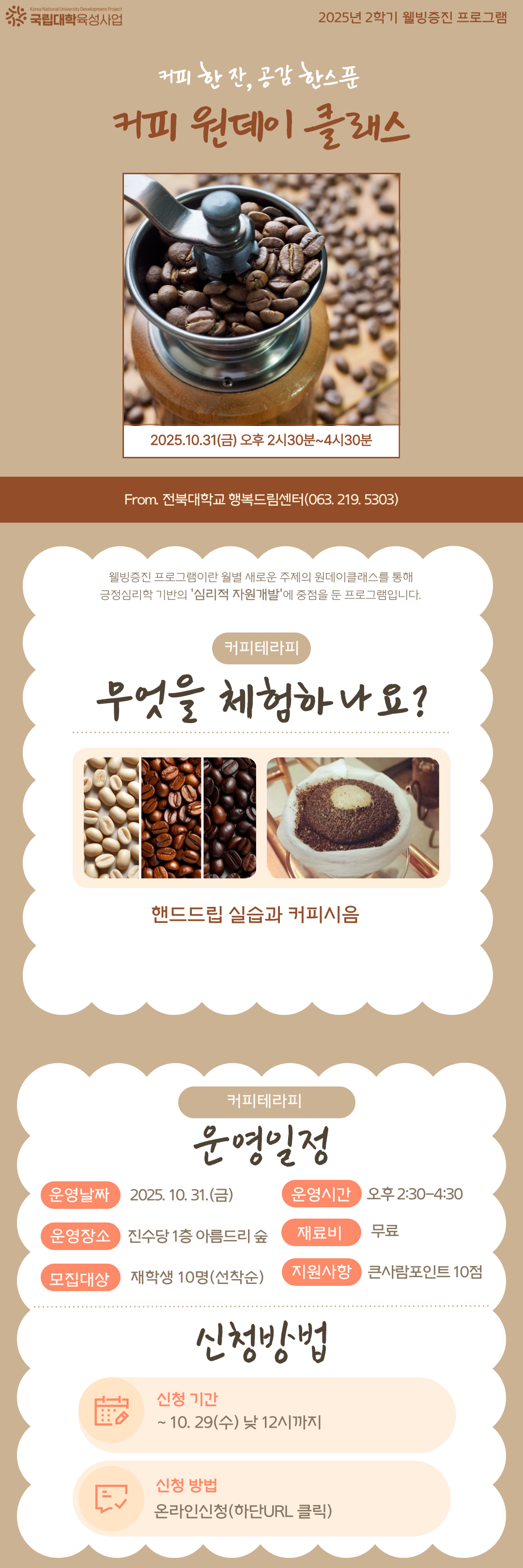 - 신청방법 : 행복드림센터 홈페이지 신청, 커피원데이 클래스 신청하러 가기