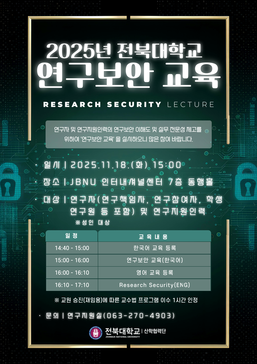 [연구지원실] 2025년 전북대학교 연구보안 교육 안내(11.18.(화) 15:00)