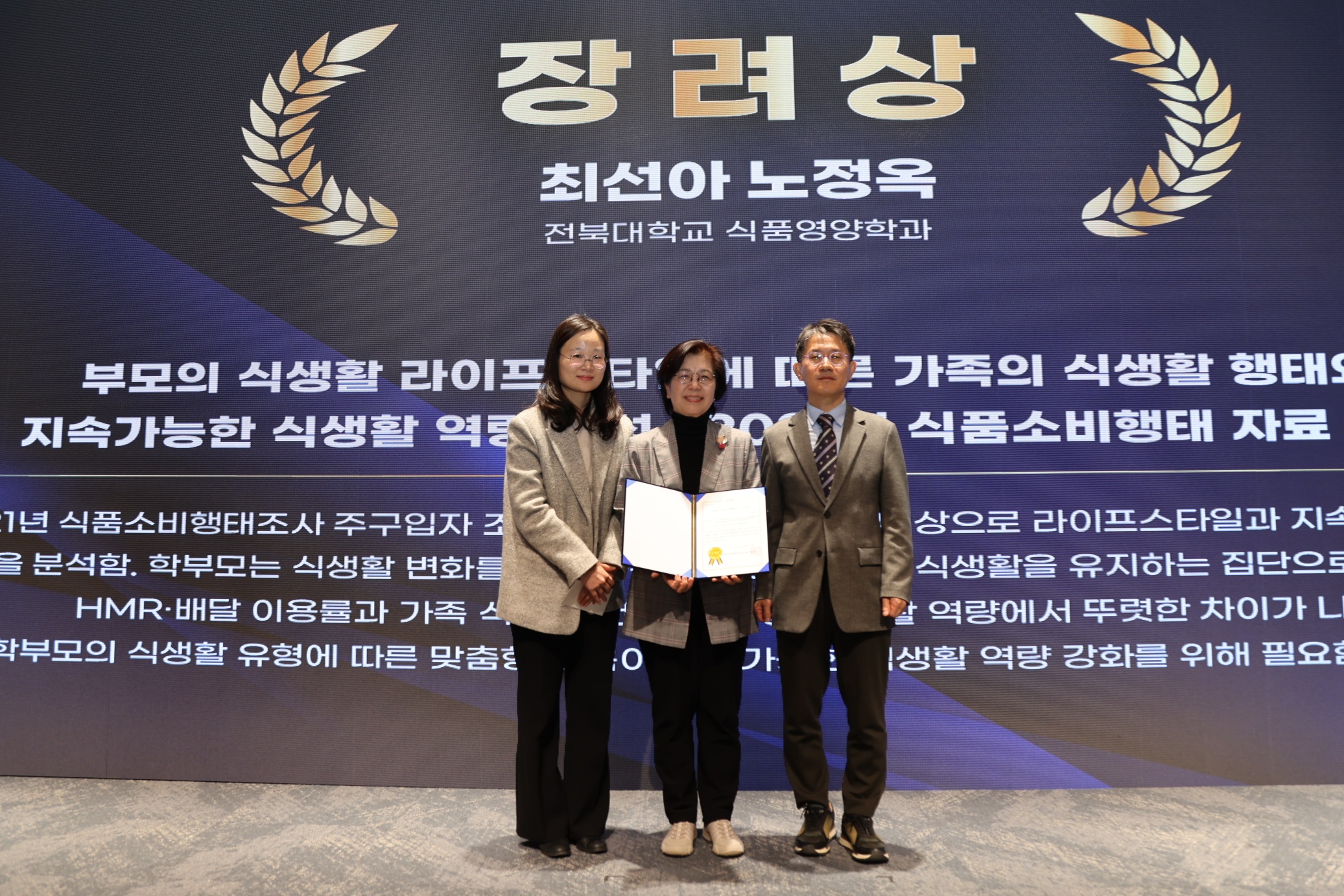 전북대학교 식품영양학과 최선아 박사과정생(급식서비스 및 조리과학연구실, 지도교수 노정옥)이 최근 한국농촌경제연구원의 식품소비행태조사 자료를 활용한 우수논문 선발대회에서 장려상을 수상했다.