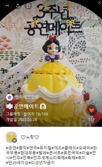 전북 지역 공연, 축제, 행사, 강연등 참여하는 모임인 <공연메이트> 입니다.장르 불문, 여가를 잘 즐기고 싶은 사람들이 모여 있습니다. 서로 정보 공유하고, 함께 또는 따로 예매, 관람하고, 후토크로 대화, 토론 나눕니다.