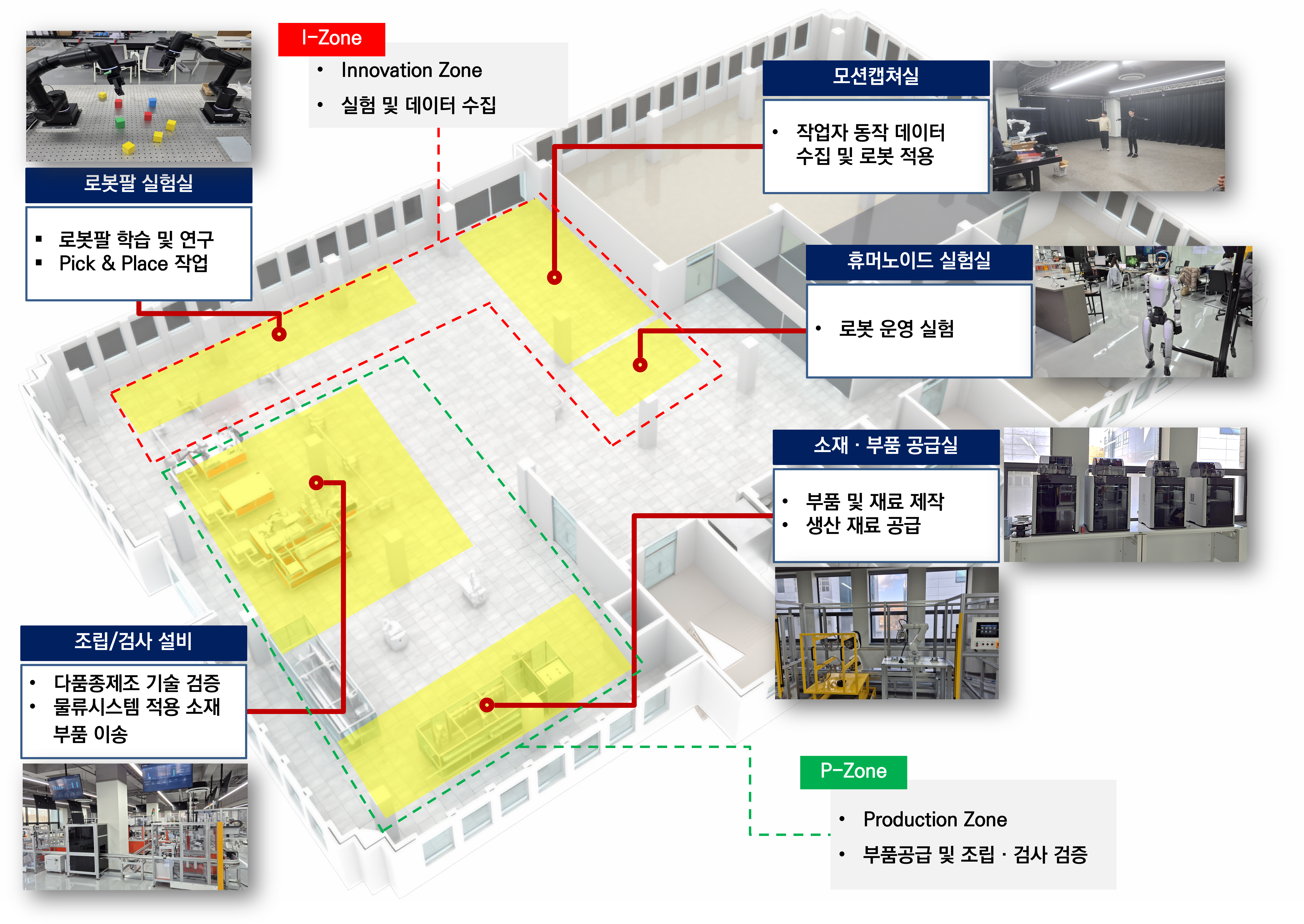 P-Zone(Production Zone)은 AMR(자율이동로봇), 산업용 로봇, 협동로봇, 비전 시스템을 연계해 소재 공급부터 가공·조립·검사·배출까지 전 공정을 통합 구현하는 유연 생산 공간이다. 사람–로봇–설비 간 협업지능과 디지털트윈 기반 통합 MES 연동을 통해 공정 흐름을 실시간으로 관리하며, 다품종·소량생산 시나리오를 검증하도록 구축됐다.