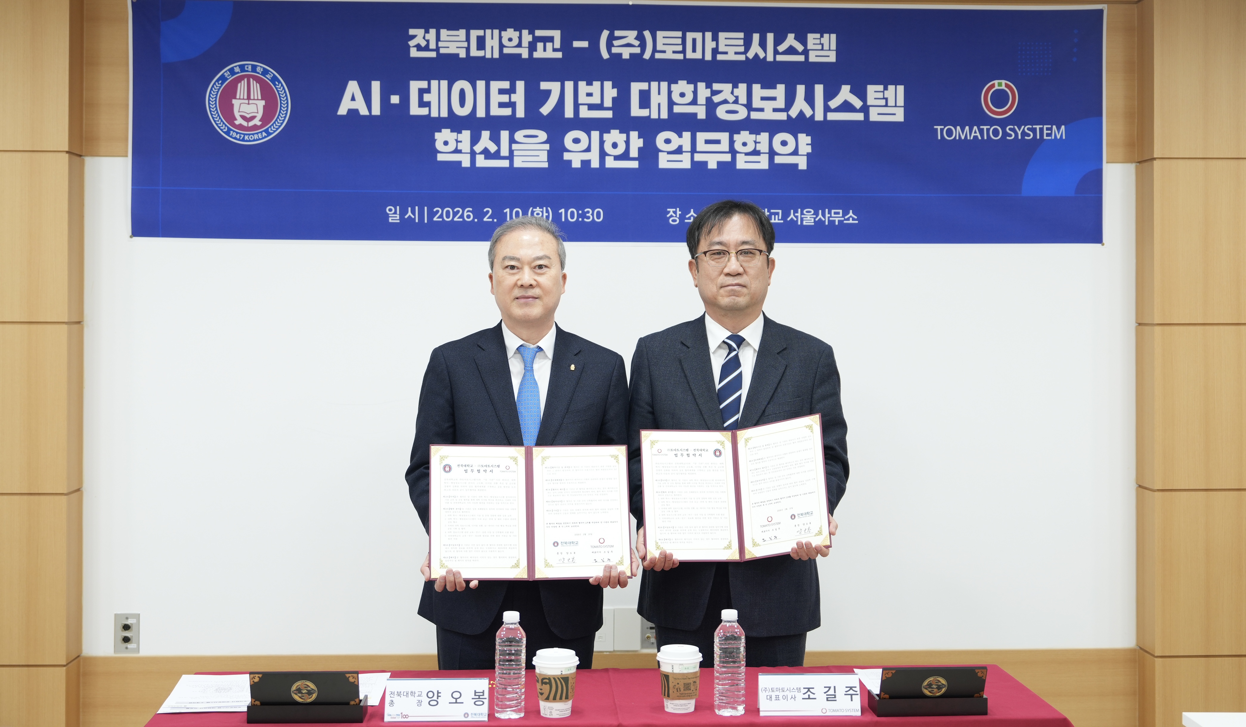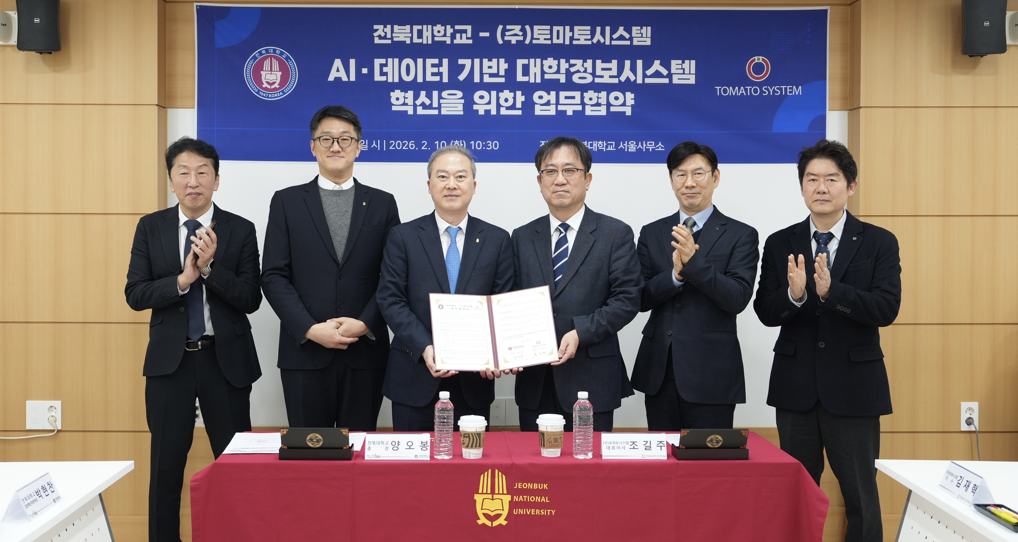 전북대는 10일 전북대학교 서울사무소에서 양오봉 총장과 조길주 토마토시스템 대표이사 등 주요 인사들이 참석한 가운데 ‘AI·데이터 기반 대학정보시스템 혁신을 위한 업무협약(MOU)’을 체결했다고 밝혔다.