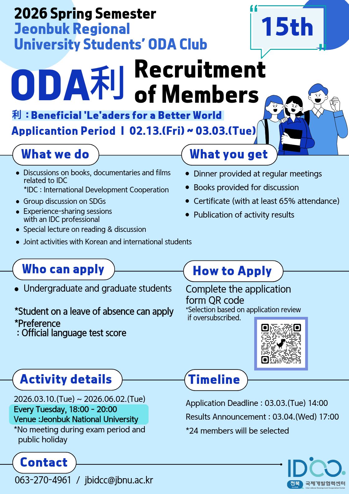 전북국제개발협력센터에서 2026 상반기 [전북지역 대학(원)생 ODA 동아리 "ODA利" 15기]를 모집합니다!