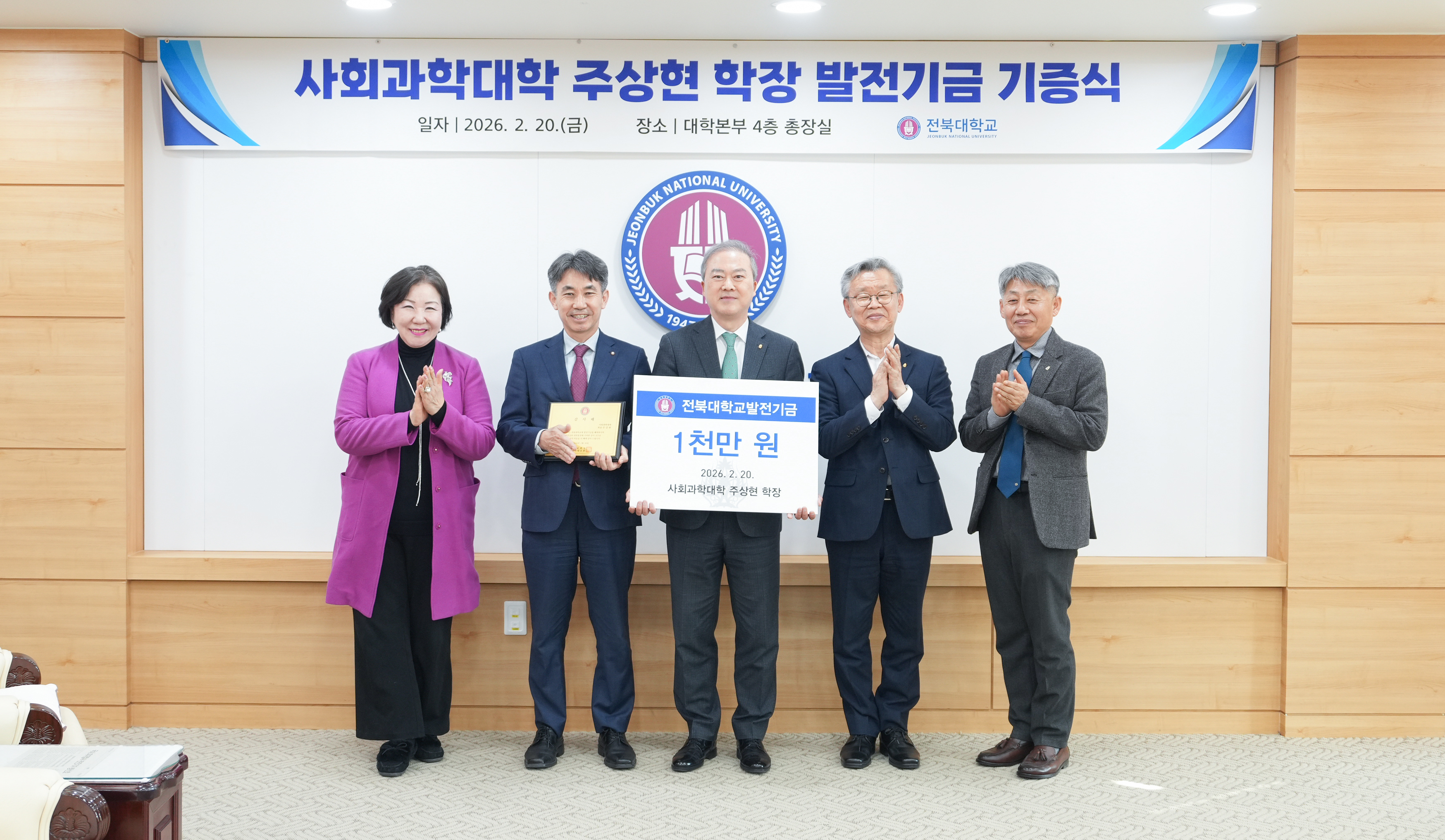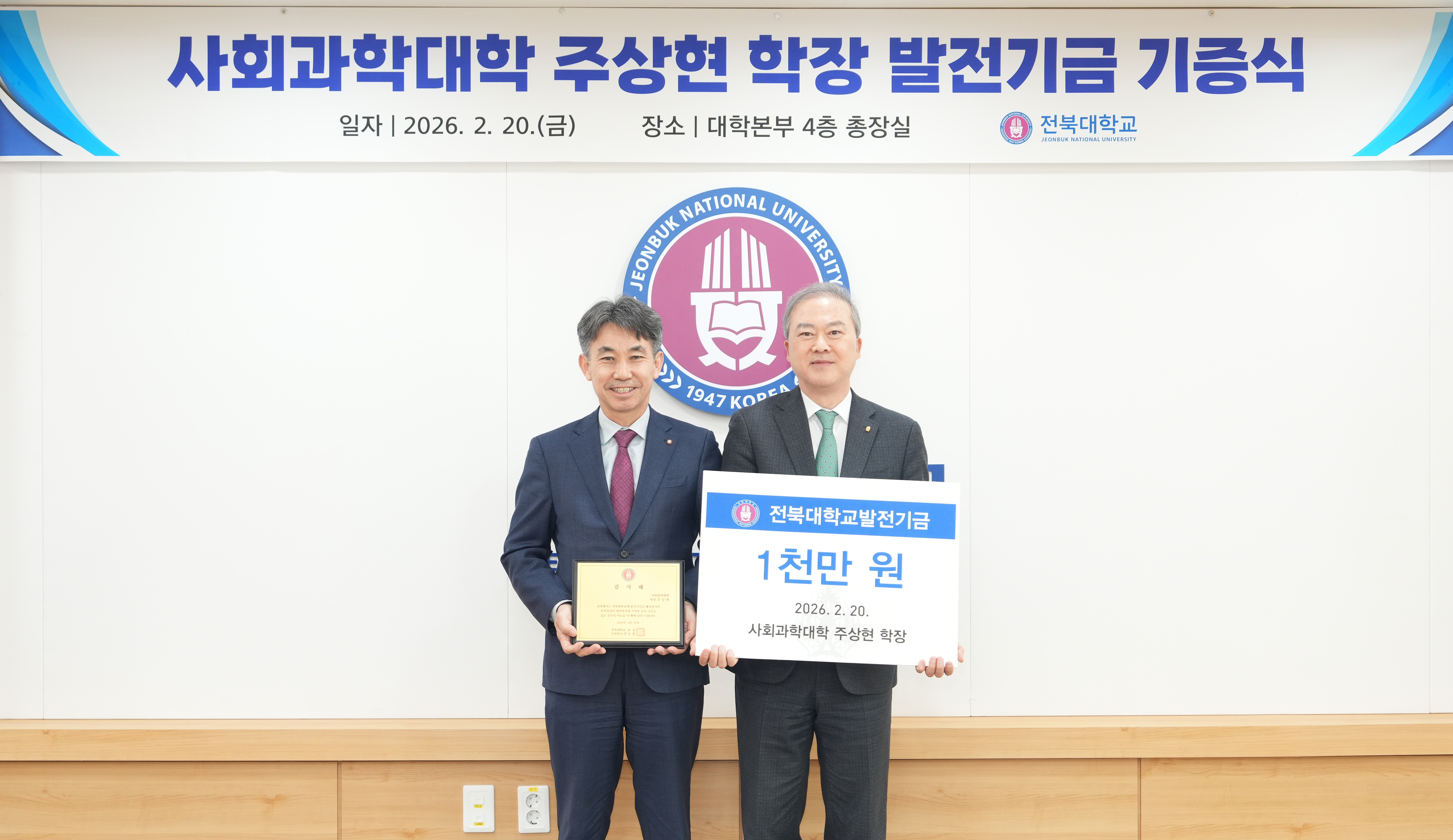 전북대는 2월 20일 오후 3시 대학본부 총장실에서 양오봉 총장과 주상현 학장이 참석한 가운데 발전기금 기증식을 개최했다고 밝혔다.