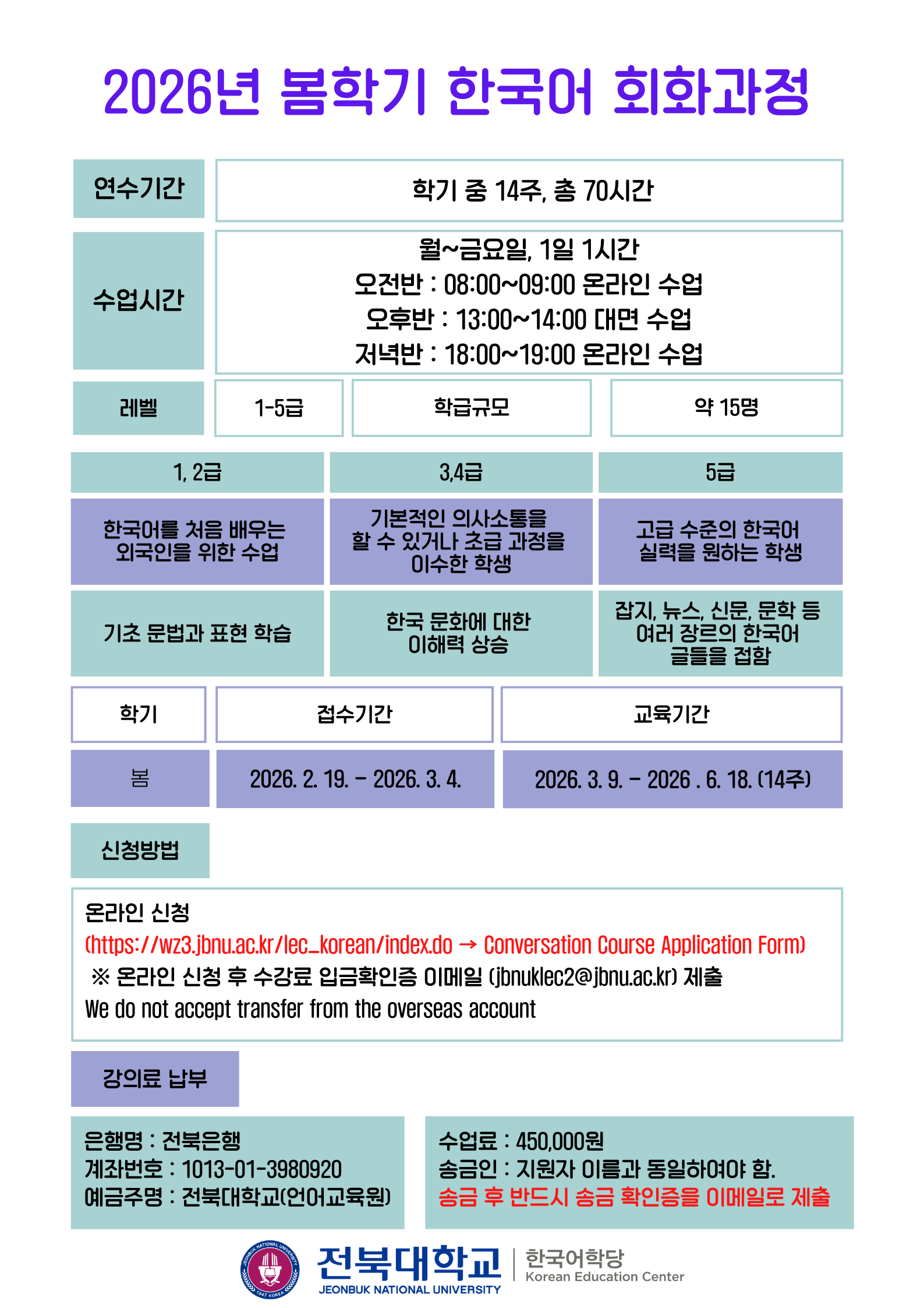 ※ After completing the payment, please send the receipt to our email: jbnuklec2@jbnu.ac.kr