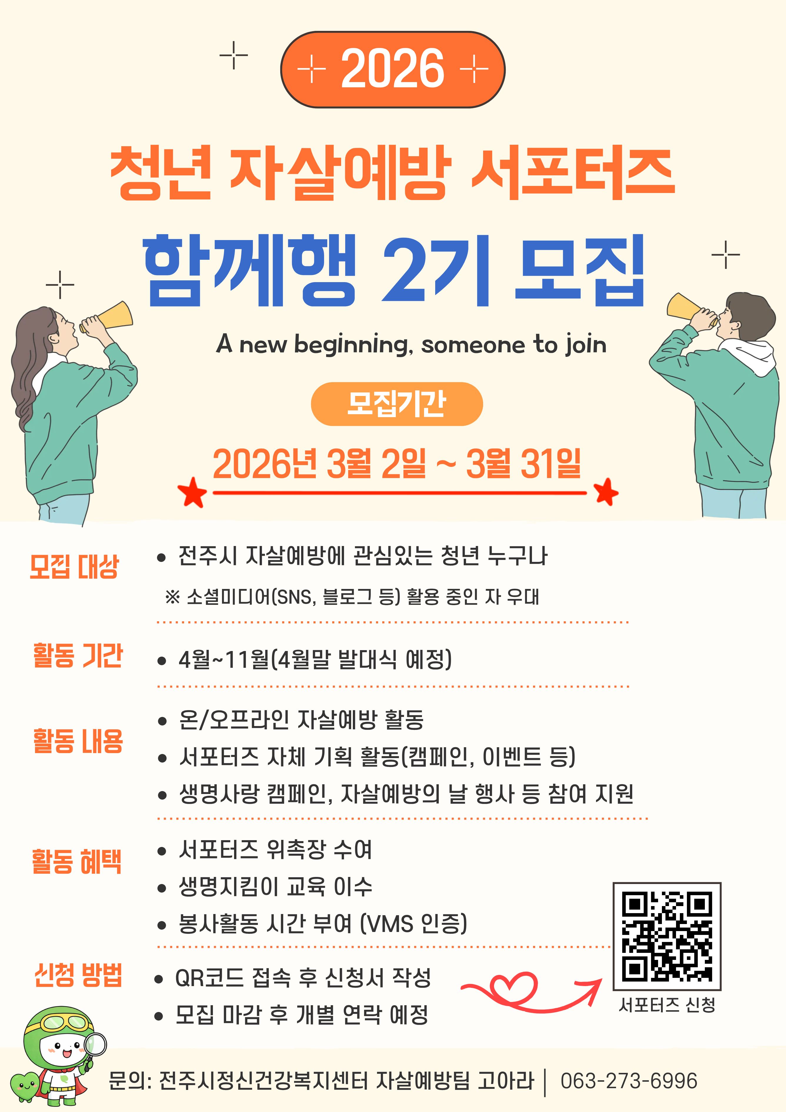 [행복드림] 전주시 정신건강복지센터 청년 자살예방 서포터즈 함께행 2기 모집 안내