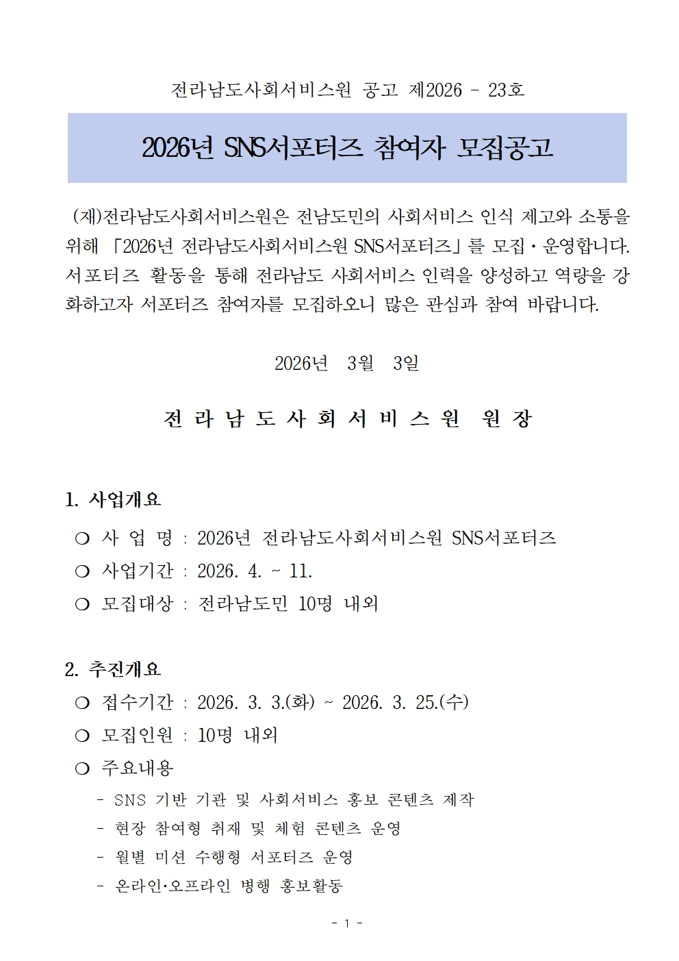 (전라남도사회서비스원) 2026년 전라남도사회서비스원 SNS서포터즈 참여자 모집 안내
