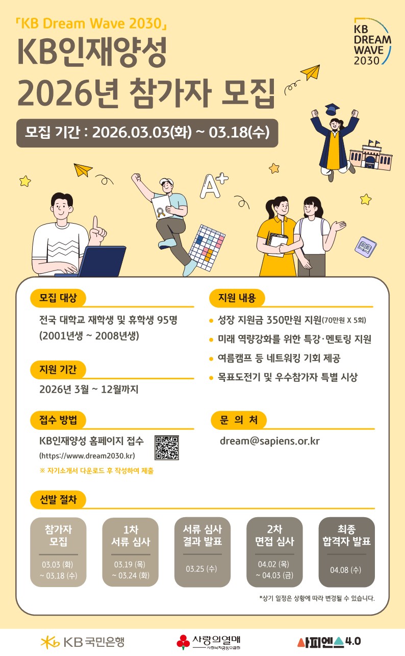 2026년 「KB Dream Wave 2030」 KB인재양성 참가자를 모집합니다. 관심있는 학생들의 참여바랍니다.