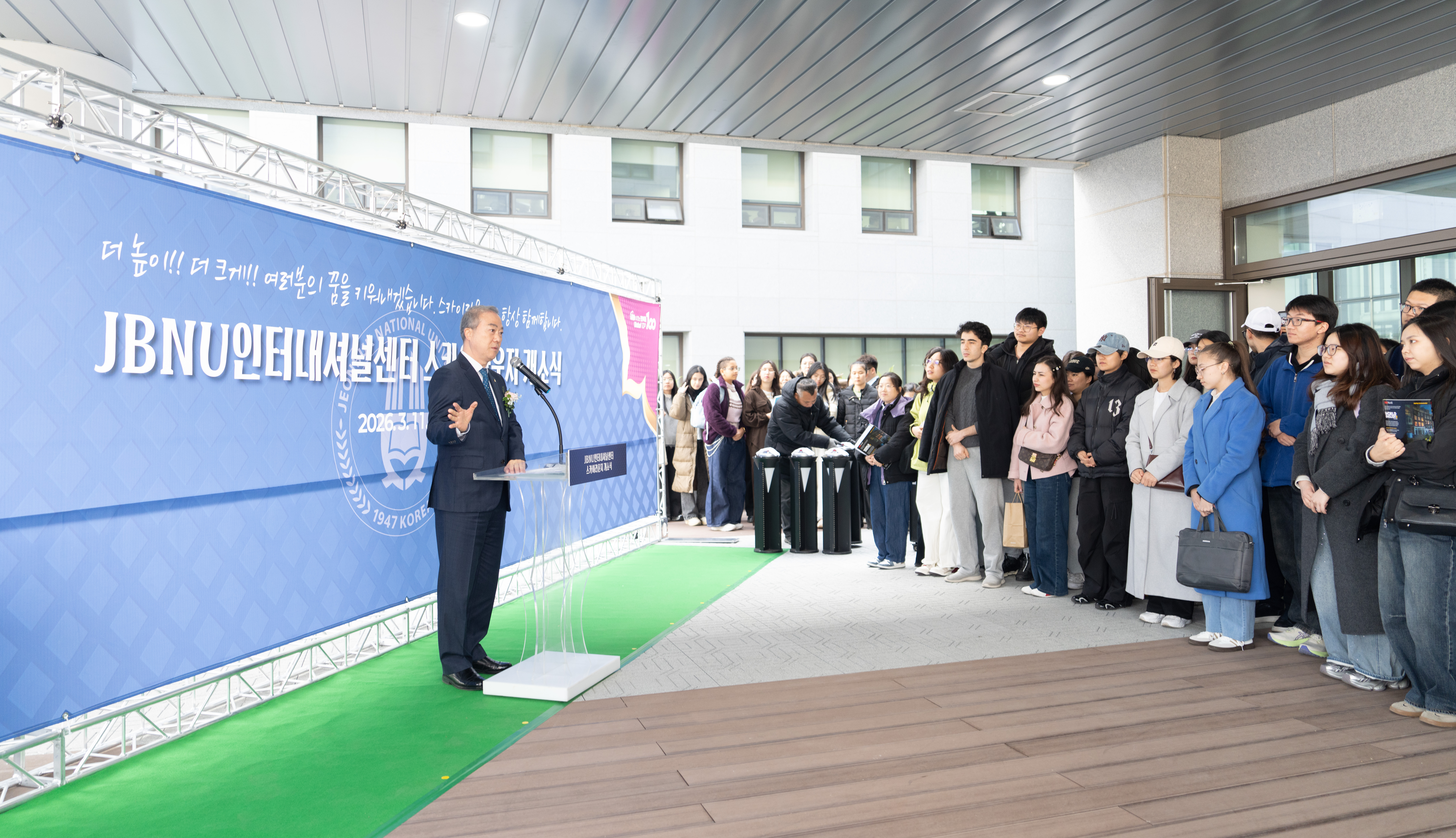 전북대는 3월 11일 오후 4시 30분 대학 국제화의 본산인 JBNU 인터내셔널센터 4층 옥상에 706㎡ 규모의 ‘스카이라운지’를 조성하고 개소식을 가졌다. 이날 열린 개소식에는 양오봉 총장을 비롯한 대학 주요 보직자, 학생대표, 국가별 유학생 대표 등이 참석해 새롭게 마련된 공간을 함께 둘러보며 개소를 축하했다.