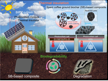 논문 제목은 ‘Highly porous biochar from spent coffee ground for fuly green thermal insulating composites with thermal conductivity of 0.04 W m−1 K−1’다. 김성진 박사과정생이 제1저자로 연구를 주도하며 우수한 연구 역량을 입증했다.