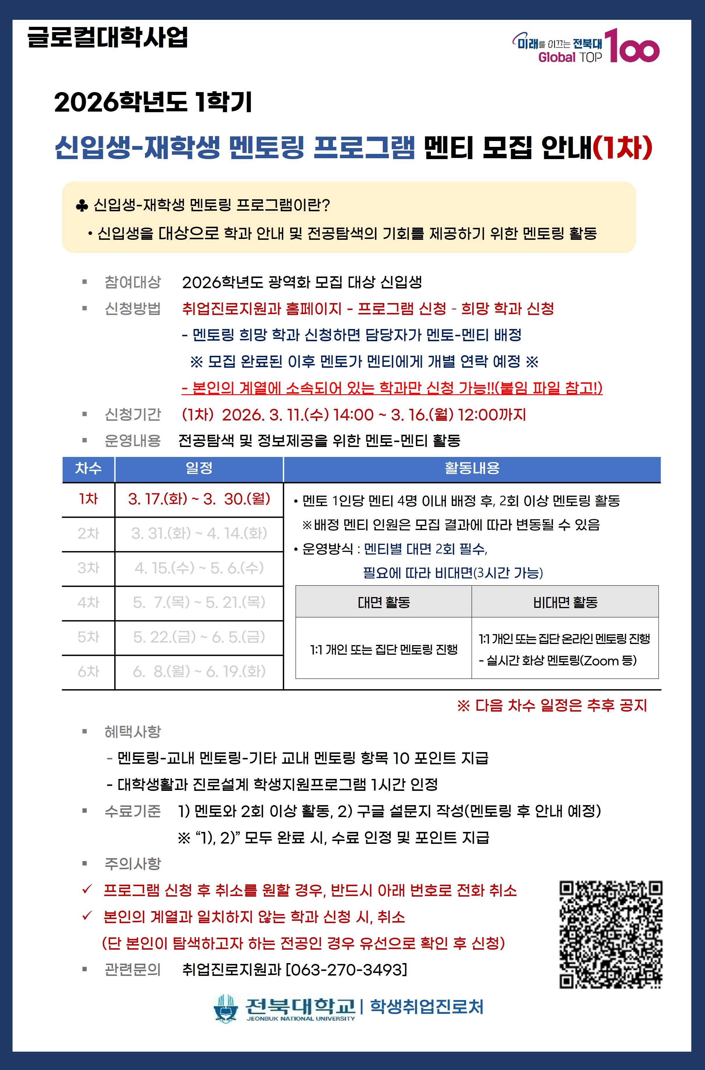 본 프로그램은 2026학년도 광역화 모집 대상 신입생에게 전공 탐색 기회를 제공하기 위해 개설된 멘토링 프로그램입니다.