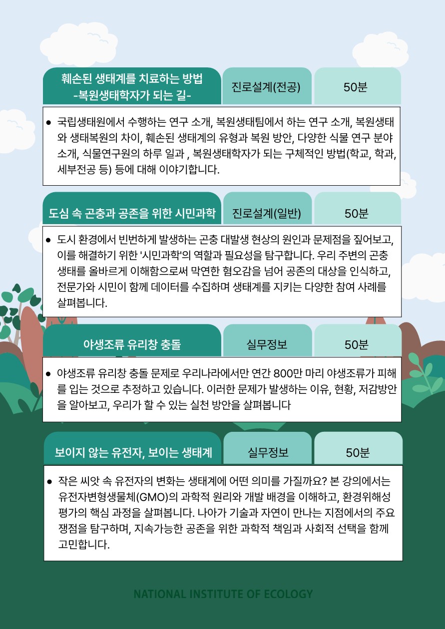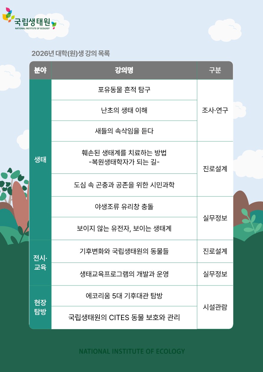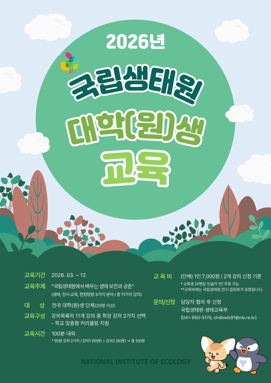 국립생태원에서 2026년 국립생태원 대학(원)생 교육을 진행합니다. 관심있는 학생들의 참여 바랍니다.