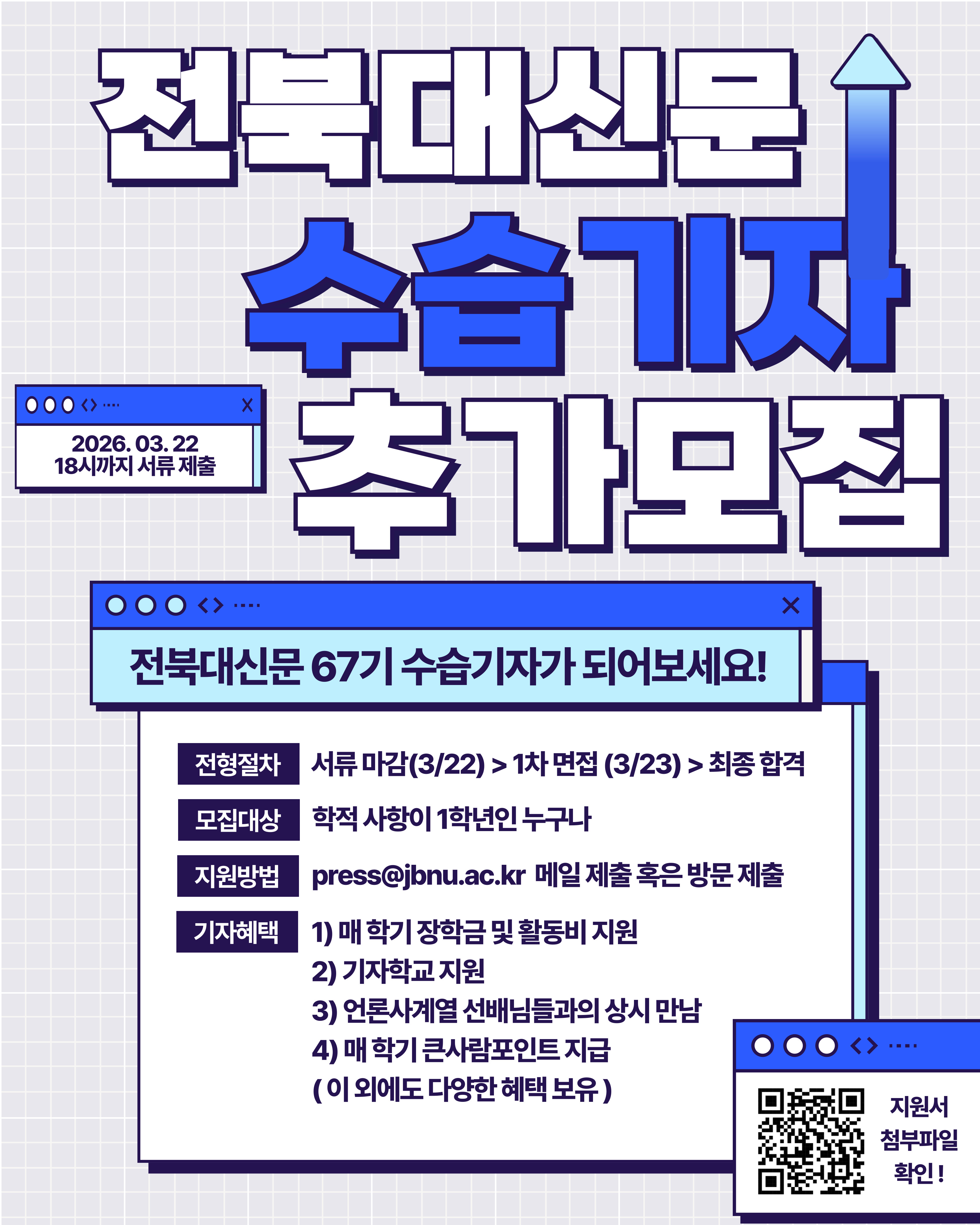 - 접수 방법: 지원서 작성 후 이메일(press@jbnu.ac.kr)로 발송 혹은 학생타운 2층 전북대신문 편집국 방문 제출