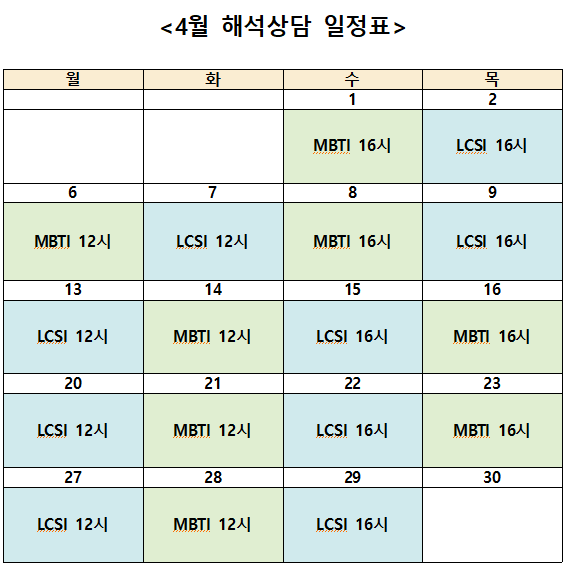 ○ 5월 심리검사 신청 일정은 4월 넷째주 월요일(4/20) 오후에 확인할 수 있습니다.