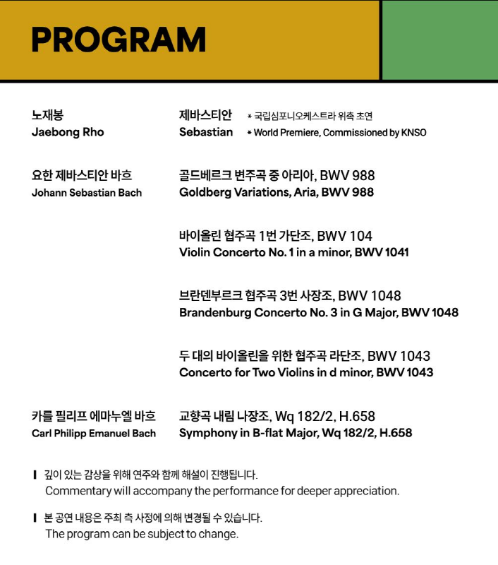 ○ 내 용: 바흐의 대표 작품과 후대 작곡가 노재봉의 음악을 함께 감상할 수 있는 클래식 공연
