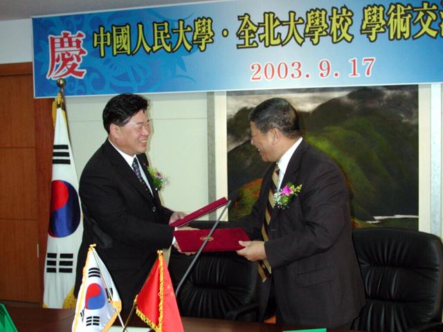 우리 대학과 중국 인민대학(총장 지바오청)이 17일 오후 대학본부 8층 회의실에서 학술교류협정을 체결하였다.