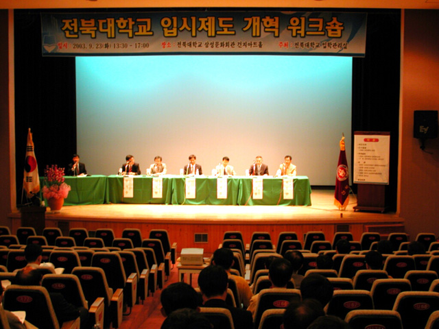 우리 대학은 고등학교 교육과정을 비정상적인 방향으로 유도하는 대학입시전형방안을 개선하여 고3병을 치유하고 사교육비 지출을 경감시키기 위하여 9월 23일(화) 전북대학교 삼성문화회관 건지아트홀에서 교육인적자원부와 대학 관계자, 고교 교사, 학부모 100여명이 참석한 가운데 입시제도 개혁 방안 워크샵을 개최하였다.