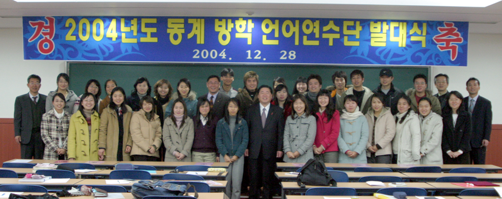 2004 동계방학 언어연수단 발대식이 28일(화) 오후 2시 진수당 2층 회의실에서 두재균 총장, 본부 보직교수 및 언어연수 선발 학생 30명이 참가한 가운데 열렸다. 이날 발대식에서는 어학연수를 인정하는 인증서를 전달하였다.