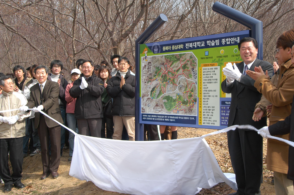 우리 대학은 전주 시민들을 위해 건지산 주변에 자연생태계 분포와 다양한 건강정보 제공을 위한 안내판을 설치하고, 3월 3일 학술림 안내판 제막식을 가졌다. 이날 열린 제막행사에는 두재균 총장을 비롯해 본부 처 실·국·부장 등이 참석했으며, 행사 후에는 학술림에 대한 시민들의 이용상 불편이나 필요한 사항을 알아보고 학술림 주변 자연환경의 친화감을 함께 나누기 위해 의대 추모공원 입구에서 장군봉에 이르는 건지산 학술림 산책코스를 돌아보았다.