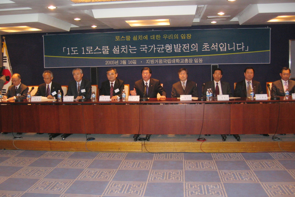 거점국립대학교총장협의회(회장: 두재균 총장)는 지난 16일 오전 11시부터 12시까지 한국 프레스센터 19층 기자회견장에서 최근 사회적 이슈가 되고 있는 법학전문대학원(로스쿨) 설치와 관련, ‘대통령님께 드리는 건의문’을 채택하는 기자회견을 가졌다. 협의회 회장인 두재균 총장은 ‘대통령님께 드리는 건의문’을 통해, 그동안 지역에 대한 불균형발전 정책과 더불어 인재양성 시스템의 부재와 빈약함 등으로 지방인재가 서울로 유출됨으로써 지방의 낙후성과 수도권의 기형적 비대화가 초래되었다고 전제하면서, 법학전문대학원 도입은 각 지역의 미래와 운명을 좌우할만한 중차대한 문제이므로 국가균형발전 차원에서 ‘1도1로스쿨’원칙으로 추진되어야 한다고 주장하였다. 또한 지역별 법학전문대학원 설치규모는 지역 여건을 고려하여 배정인원은 탄력적으로 적용할 수 있을 것이며, 이로 인해 지역에 고급인재 양성의 틀을 갖추게 되면 강한 국민통합력 창출과 무한한 국가균형발전의 초석이 될 것이라고 주장하였다. 이 날 기자회견에 참석한 거점국립대학총장은 전북대(회장교) 두재균총장, 강원대 최현섭총장, 경북대김달웅총장, 부산대 김인세총장, 경상대 조무제총장, 전남대 강정채총장(대리참석: 정종휴 법대학장), 제주대 안영화 총장(대리참석:양석완 법대학장), 충남대 양현수총장, 충북대 신방웅총장 등이다.