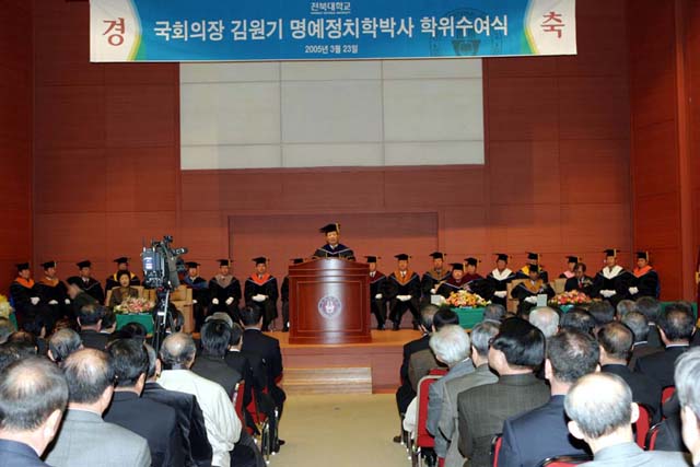김원기 국회의장이 23일 오전 11시 진수당 온고을홀에서 두재균 총장, 처·단·국장, 학장 등 보직교수 및 도내 정관계 인사 200여명이 참석한 가운데 명예정치학박사학위를 받았다.