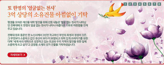 평생을 모아온 재산을 대학 발전을 위해 선뜻 내놓은 ‘얼굴 없는 천사’가 나타났던 우리 대학에 또 한명의 얼굴 없는 천사가 나타나 아름다운 기부로 따뜻함을 안겨주고 있다.