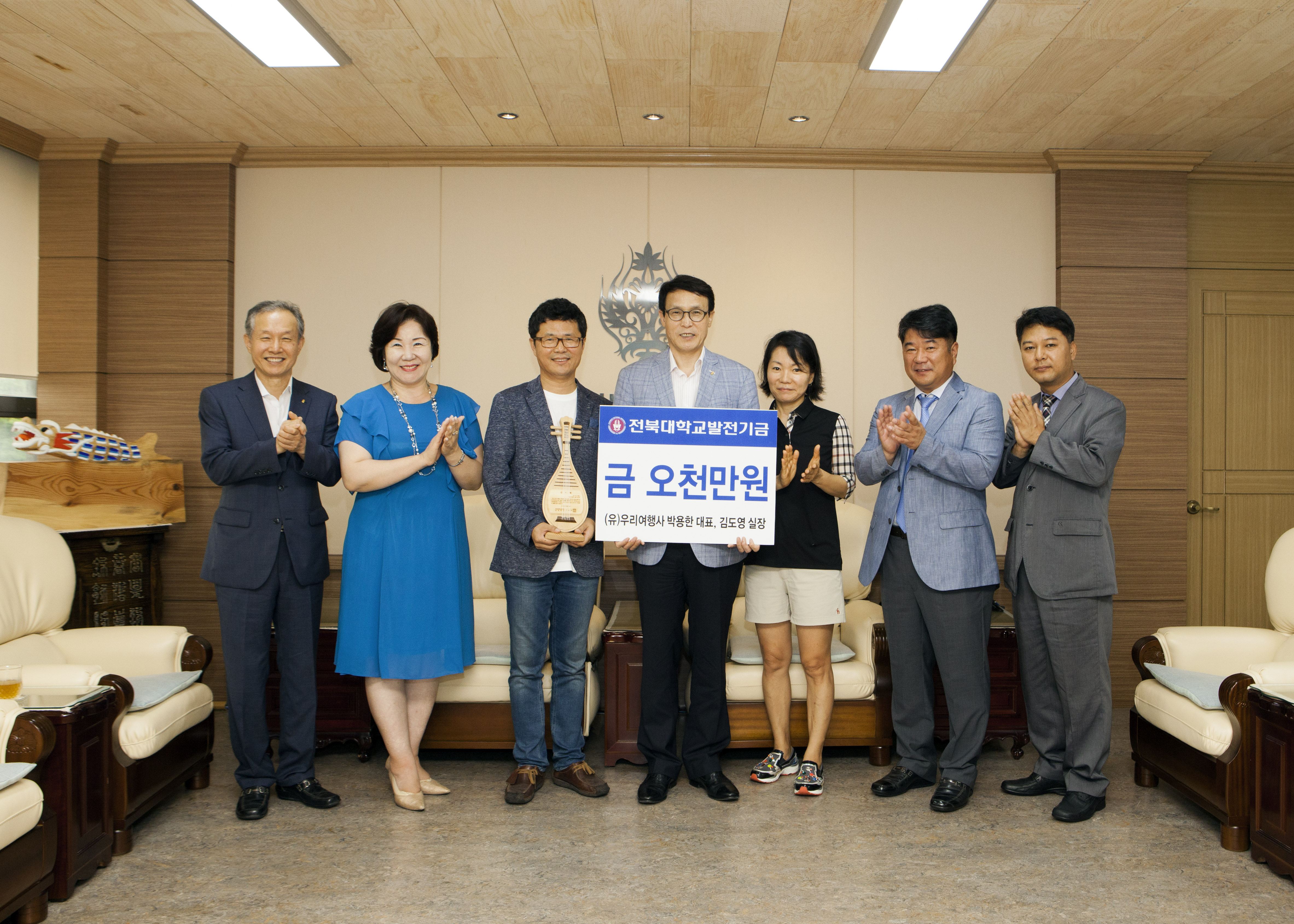 우리대학 최고위과정 2기 원우인 박용한 (유)우리여행사 대표와 김도영 실장이 7월 21일 대학을 찾아 대학 발전을 기원하며 5천만 원의 발전기금을 기탁했다.